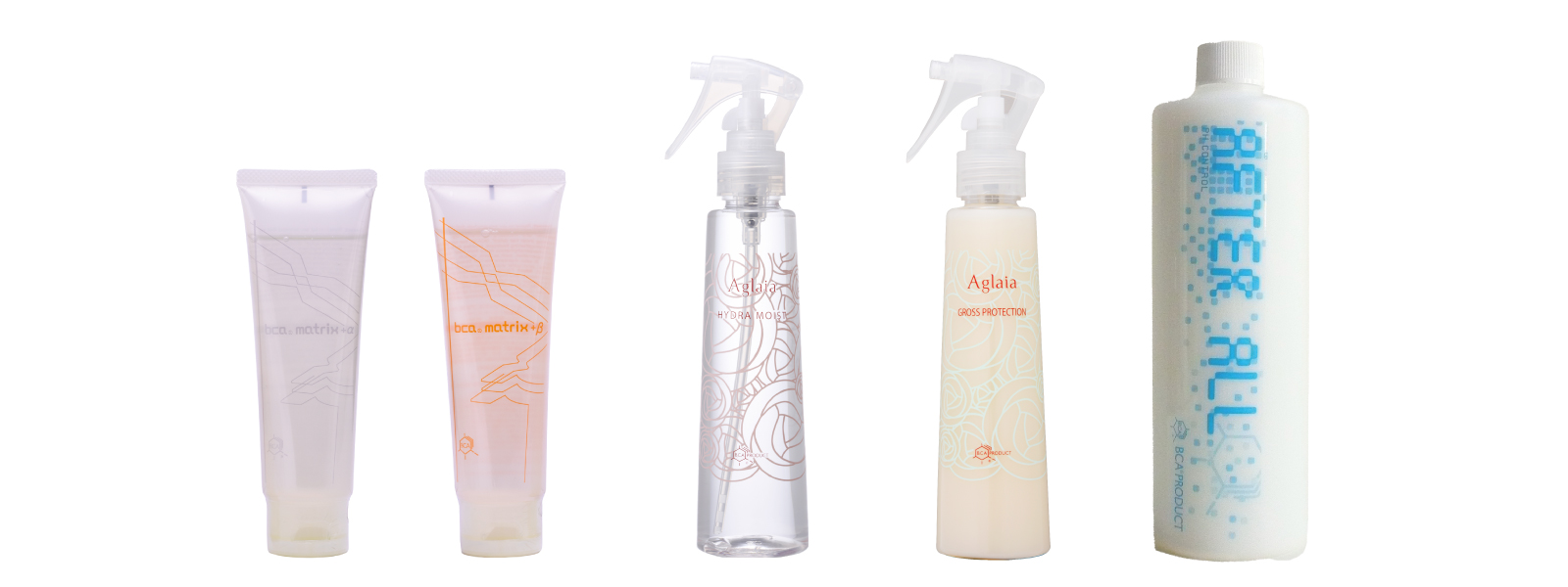 ダメージ度の高い髪に、綺麗に質感アップストレートをし、ハンドブローで「さらつやストレート」の美しさを継続させる為に、「α・β・イドラモイスト・グロスプロテクション・アフターオール・浸透水」などの処理剤を使用します。